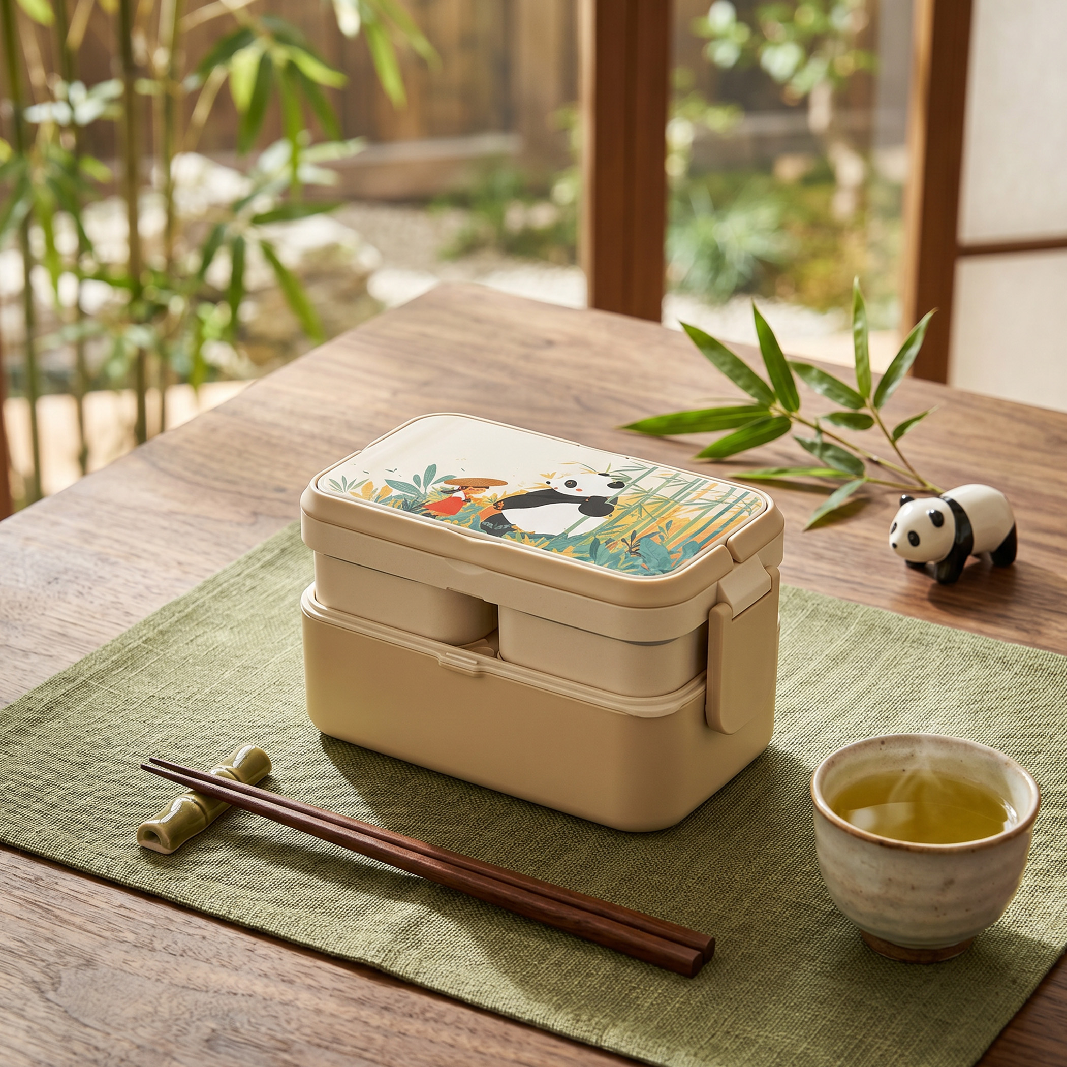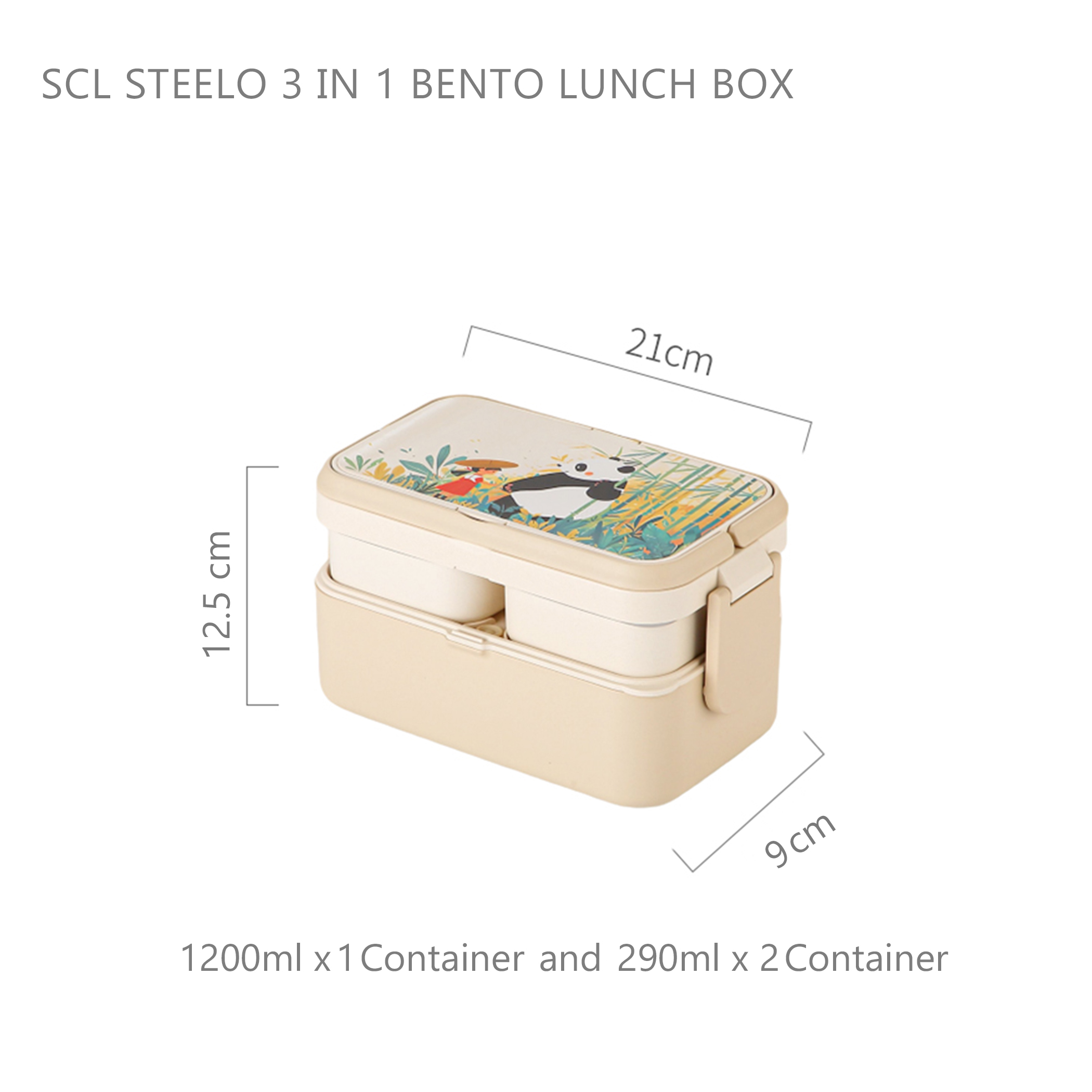 SCL Steelo 3 in 1 Bento Lunch Box |Panda Printed Beige Bamboo Fibre Tiffin Box with Fork & Spoon |Eco-Friendly, Microwavable & Dishwasher Safe