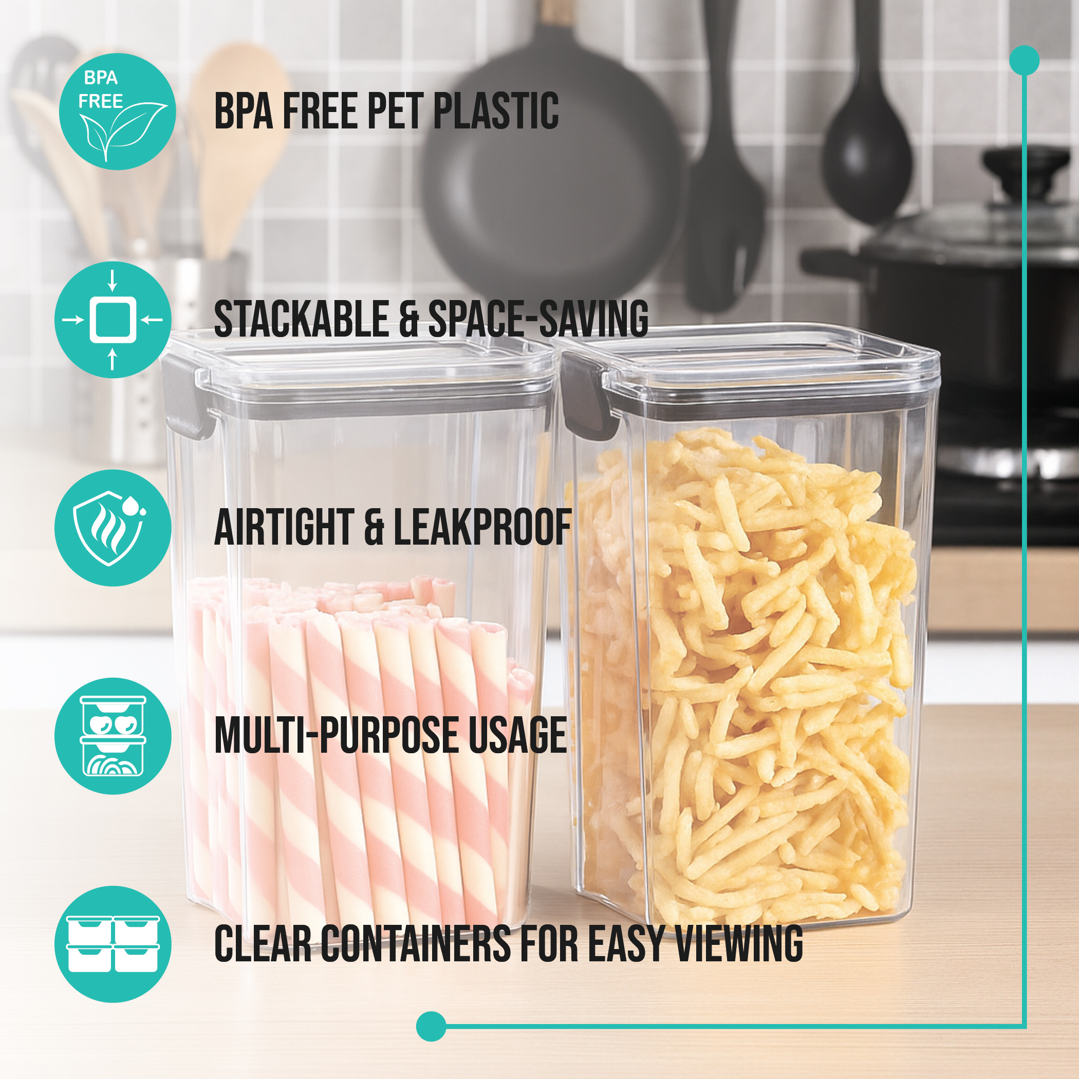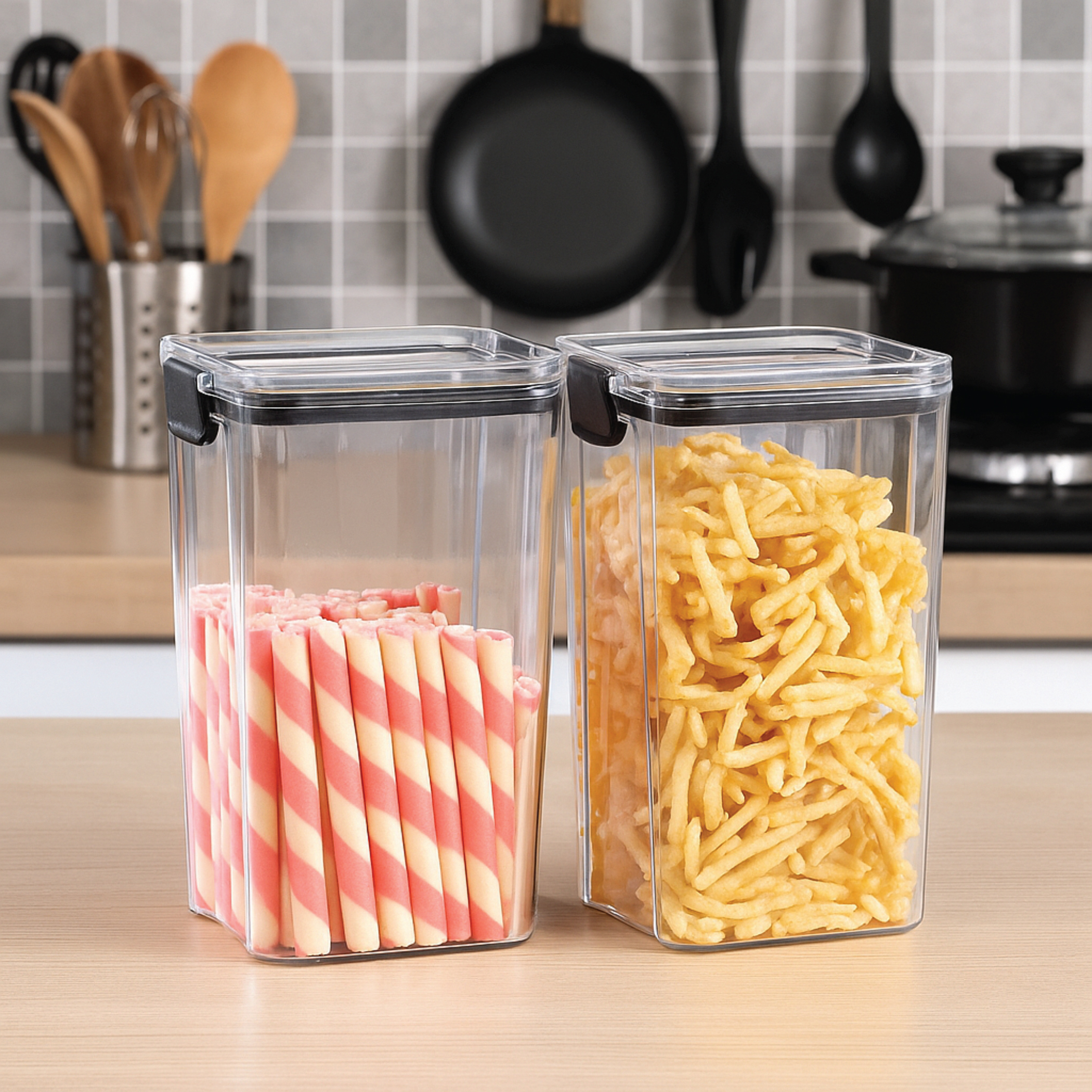 | – a smart, space-saving solution designed to keep your snacks, pulses, cereals, and dry fruits fresher for longer. Crafted from durable BPA-free plastic, these containers come with secure clip-lock lids that seal tightly to prevent moisture and air from getting in. The modular design allows for easy stacking, maximizing storage in cabinets, drawers, or countertops. Their crystal-clear body lets you instantly recognize contents, making kitchen organization effortless. |