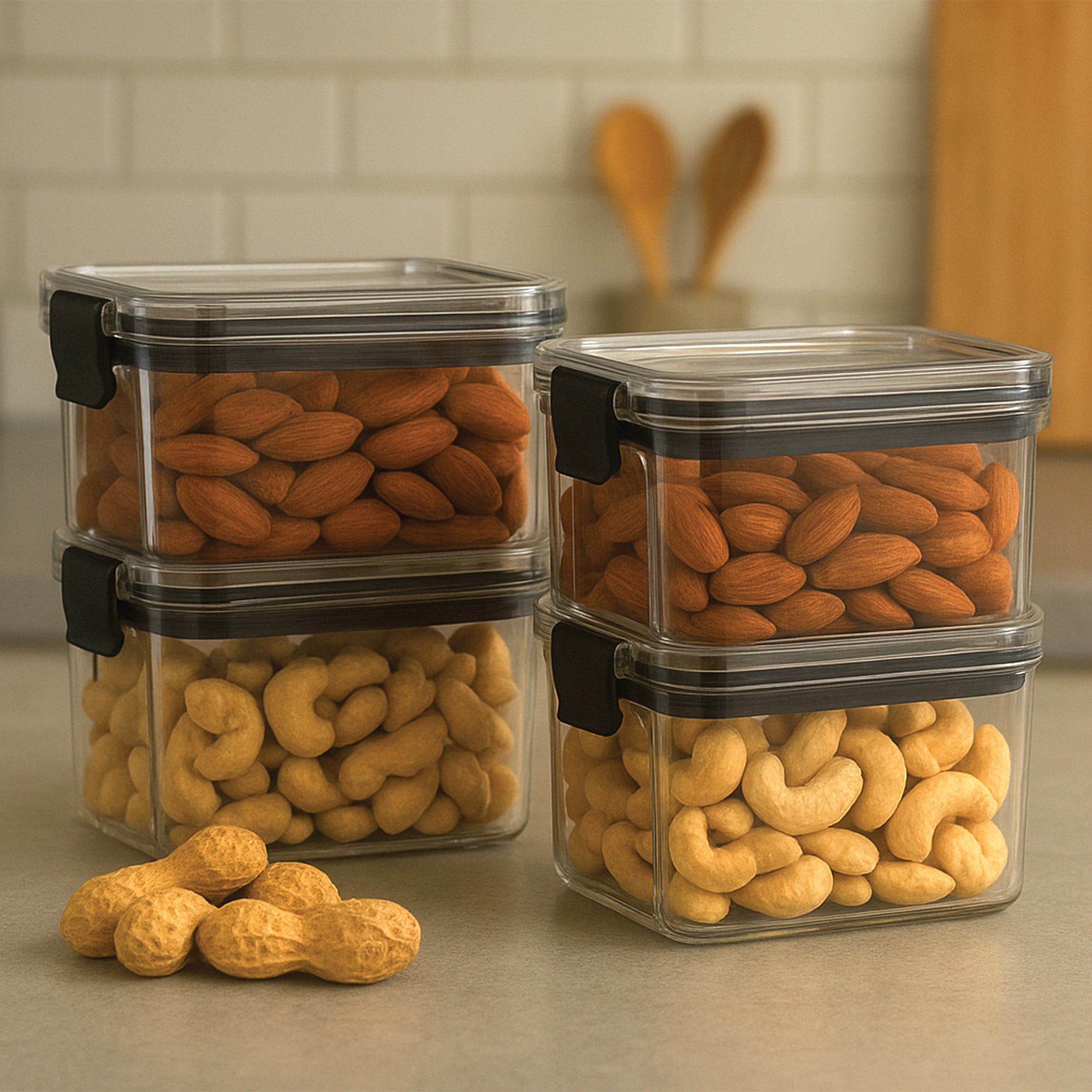 | – a smart, space-saving solution designed to keep your snacks, pulses, cereals, and dry fruits fresher for longer. Crafted from durable BPA-free plastic, these containers come with secure clip-lock lids that seal tightly to prevent moisture and air from getting in. The modular design allows for easy stacking, maximizing storage in cabinets, drawers, or countertops. Their crystal-clear body lets you instantly recognize contents, making kitchen organization effortless. |