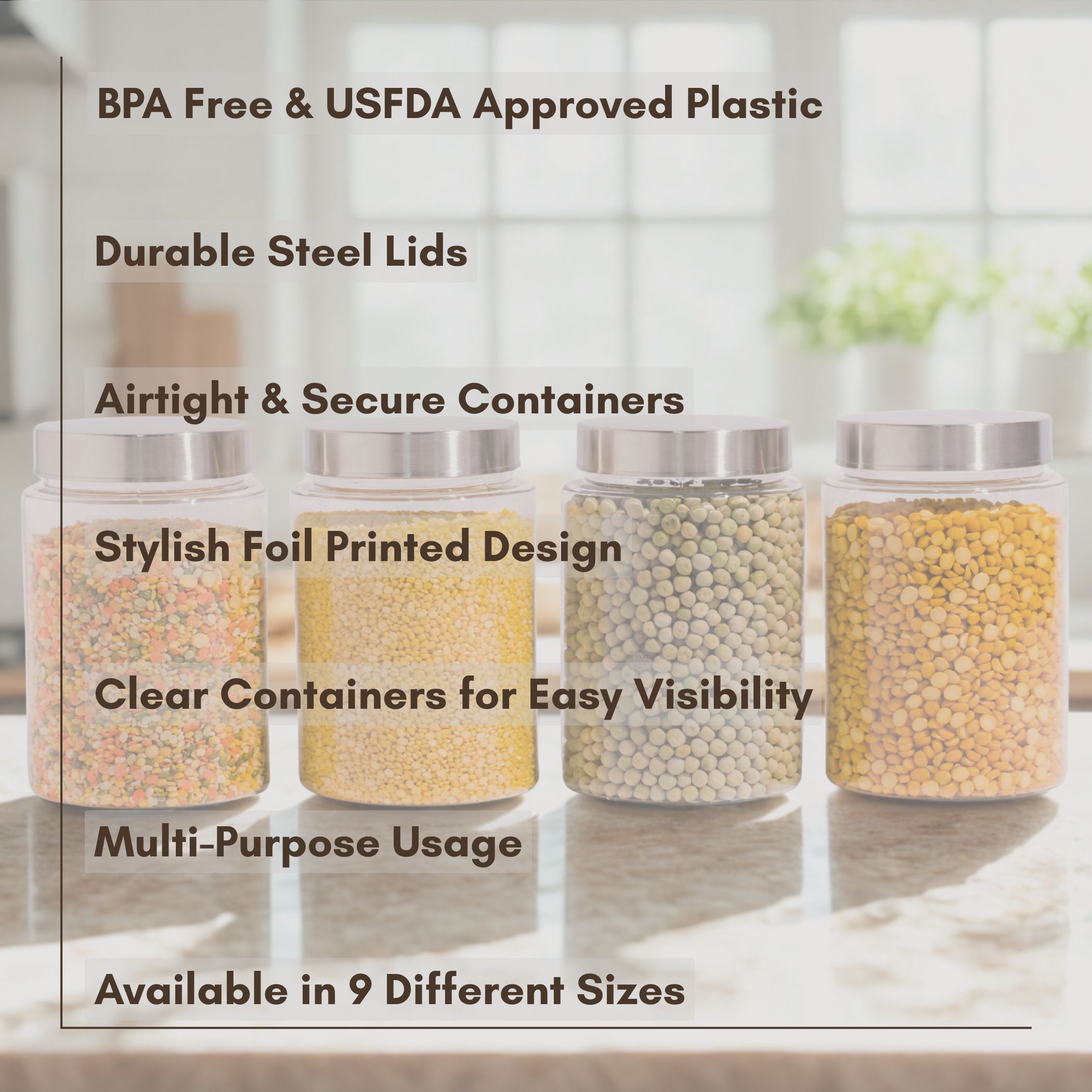 | ✔ Multi-Purpose Storage – Ideal for storing snacks, grains, pulses, masalas, fruits, leftovers, and more. |