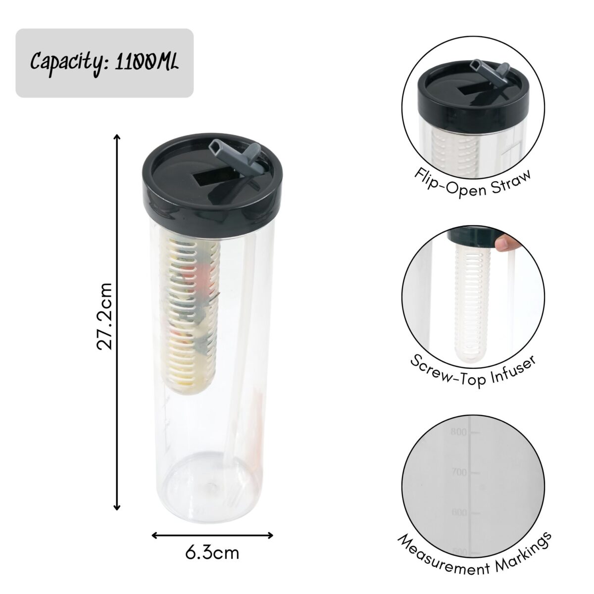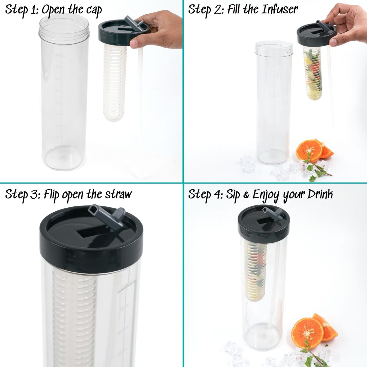 Built-in Fruit Infuser Rod – Add lemon, mint, cucumber, or berries for a natural flavor boost throughout the day.