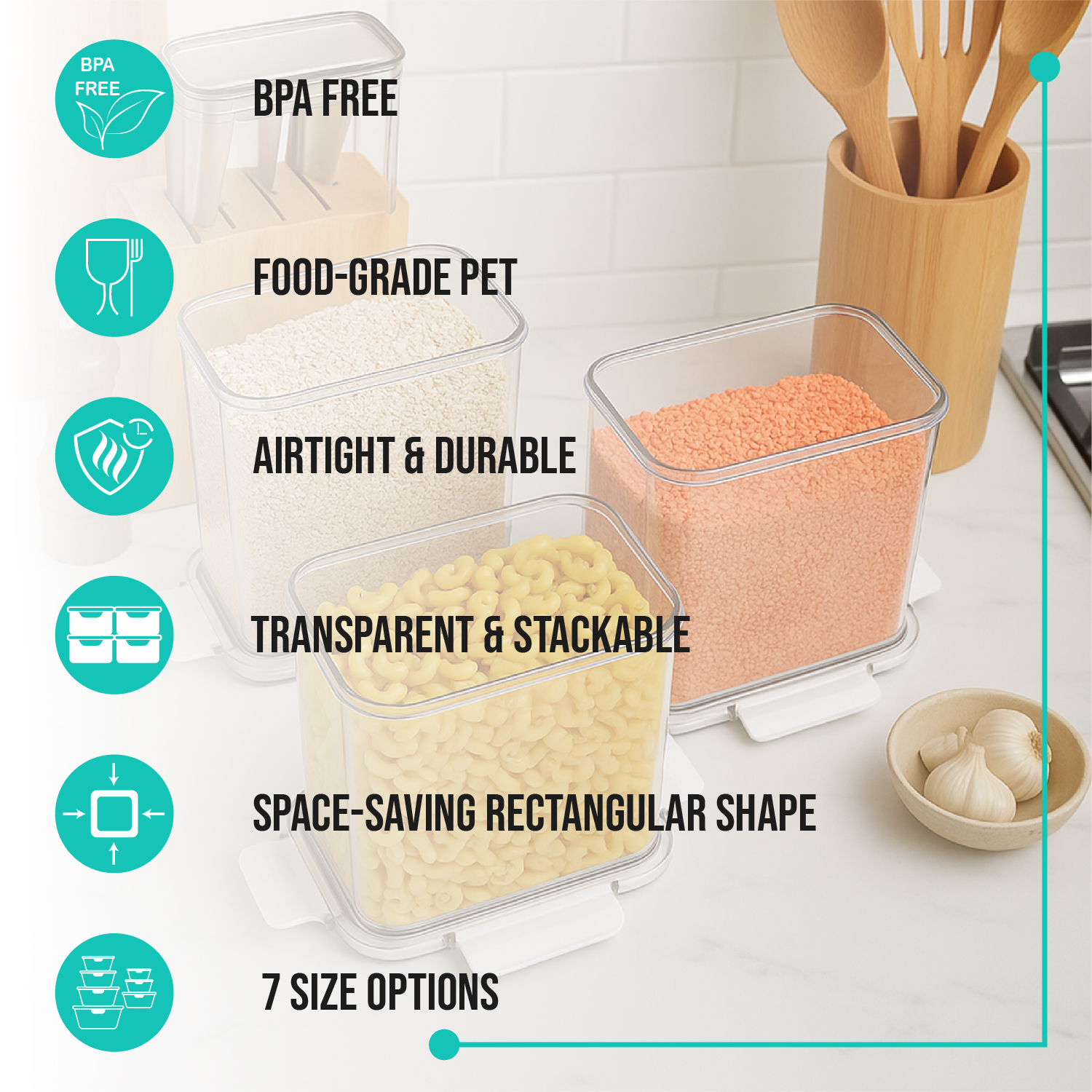 | -a smart and space-saving storage solution designed to keep your pantry, fridge, and kitchen neatly arranged. Made from durable, food-grade PET plastic, these transparent containers are ideal for storing everything from lentils and spices to snacks, pulses, cereals, fruits, and leftovers. The rectangular shape helps maximize shelf space, while the secure-fit lids ensure your food stays fresh and protected from moisture. Available in 7 versatile sizes (300ml, 500ml, 800ml, 900ml, 1200ml, 1400ml, and 2000ml), these containers offer a perfect fit for every storage need — whether you’re meal-prepping, bulk-storing groceries, or tidying up a packed refrigerator. |