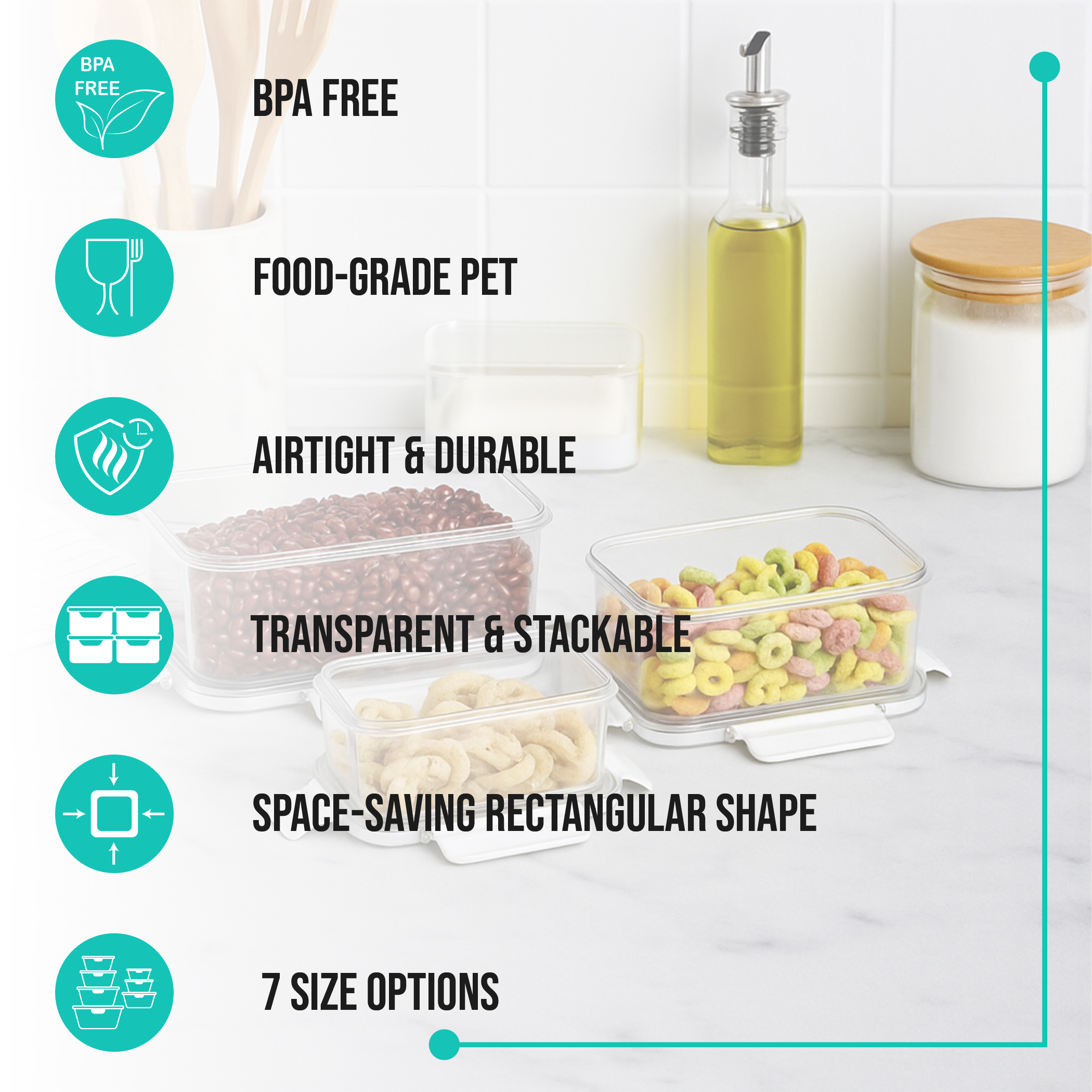 | -a smart and space-saving storage solution designed to keep your pantry, fridge, and kitchen neatly arranged. Made from durable, food-grade PET plastic, these transparent containers are ideal for storing everything from lentils and spices to snacks, pulses, cereals, fruits, and leftovers. The rectangular shape helps maximize shelf space, while the secure-fit lids ensure your food stays fresh and protected from moisture. Available in 7 versatile sizes (300ml, 500ml, 800ml, 900ml, 1200ml, 1400ml, and 2000ml), these containers offer a perfect fit for every storage need — whether you’re meal-prepping, bulk-storing groceries, or tidying up a packed refrigerator. |