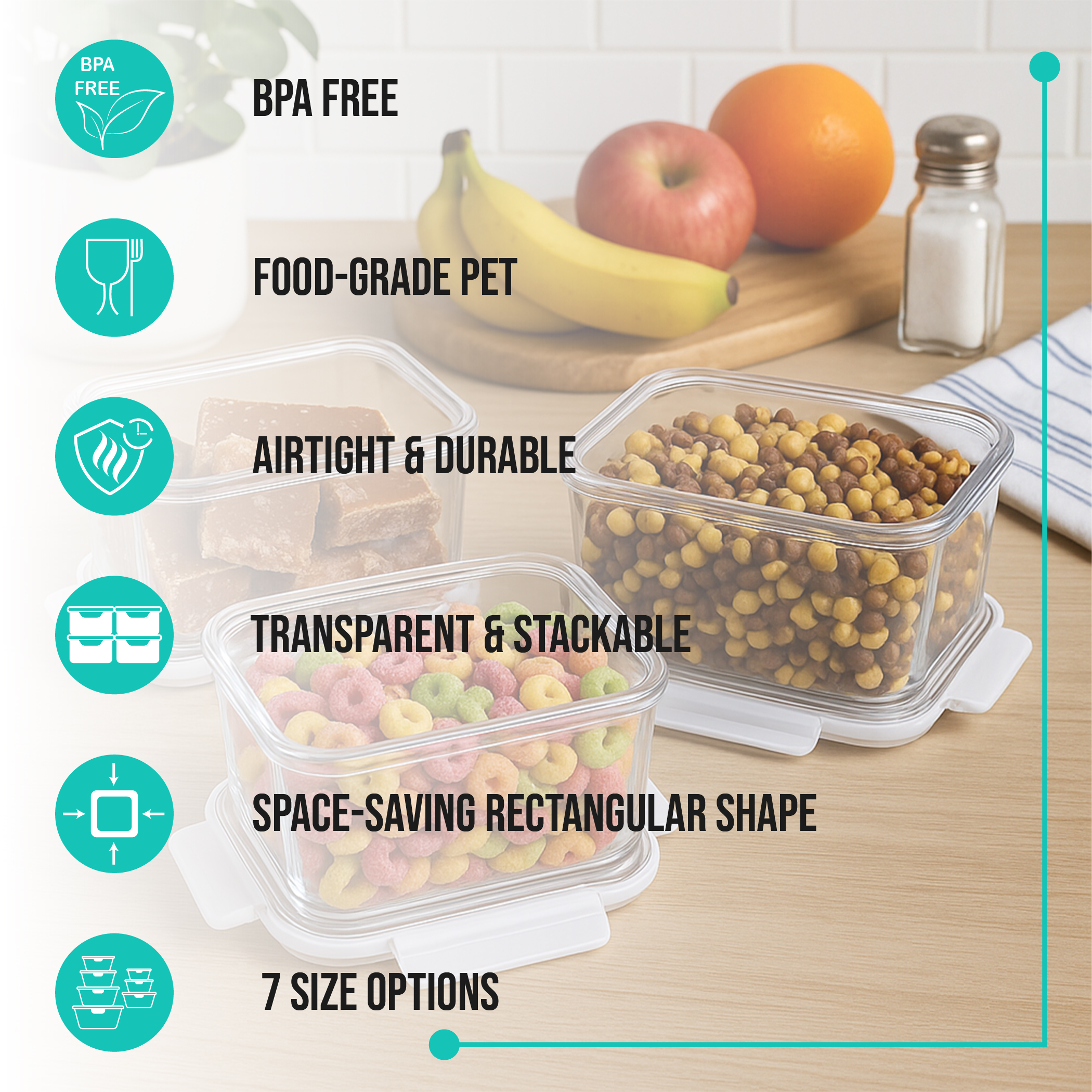 | -a smart and space-saving storage solution designed to keep your pantry, fridge, and kitchen neatly arranged. Made from durable, food-grade PET plastic, these transparent containers are ideal for storing everything from lentils and spices to snacks, pulses, cereals, fruits, and leftovers. The rectangular shape helps maximize shelf space, while the secure-fit lids ensure your food stays fresh and protected from moisture. Available in 7 versatile sizes (300ml, 500ml, 800ml, 900ml, 1200ml, 1400ml, and 2000ml), these containers offer a perfect fit for every storage need — whether you’re meal-prepping, bulk-storing groceries, or tidying up a packed refrigerator. |