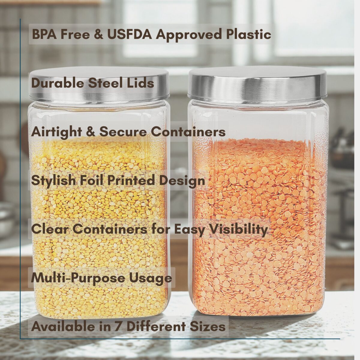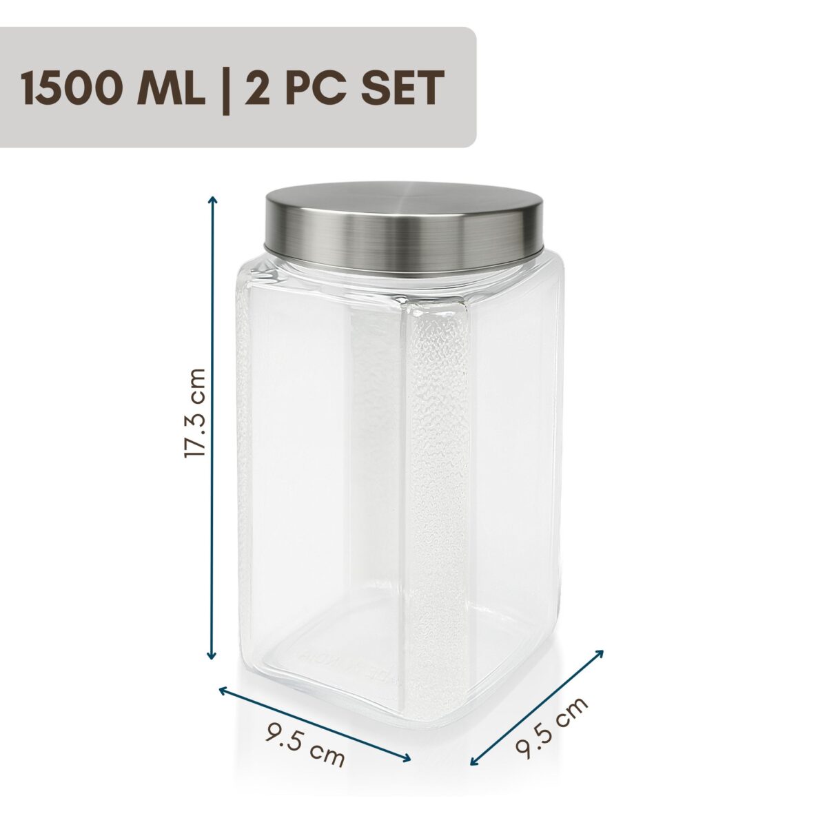 – the perfect blend of clarity, strength, and sophistication. Each container is made from crystal-clear BPA-free plastic and topped with a sleek stainless steel lid for an airtight seal. Whether you’re storing grains, dals, spices, or dry snacks, these jars keep your food fresh and visible at all times. Designed to be stackable, space-saving, and modern, these jars bring effortless elegance to your kitchen shelves and drawers. Their square shape ensures maximum utilization of storage space, and their clear body makes it easy to monitor stock levels. Durable, hygienic, and beautifully designed, the Varg Stainless Jar Set is your go-to solution for a clean and efficient kitche |