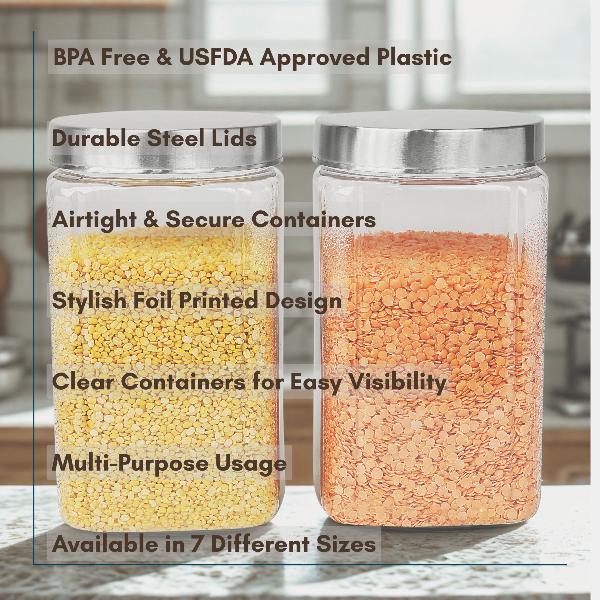 | – the perfect blend of clarity, strength, and sophistication. Each container is made from crystal-clear BPA-free plastic and topped with a sleek stainless steel lid for an airtight seal. Whether you’re storing grains, dals, spices, or dry snacks, these jars keep your food fresh and visible at all times. Designed to be stackable, space-saving, and modern, these jars bring effortless elegance to your kitchen shelves and drawers. Their square shape ensures maximum utilization of storage space, and their clear body makes it easy to monitor stock levels. Durable, hygienic, and beautifully designed, the Varg Stainless Jar Set is your go-to solution for a clean and efficient kitche |