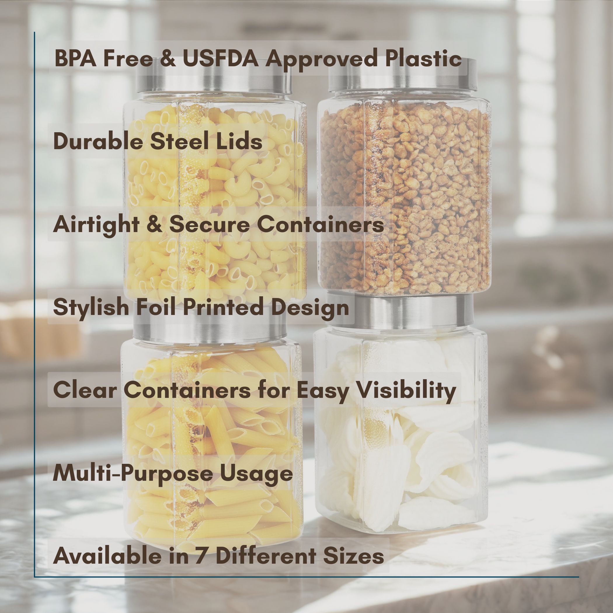 | – the perfect blend of clarity, strength, and sophistication. Each container is made from crystal-clear BPA-free plastic and topped with a sleek stainless steel lid for an airtight seal. Whether you’re storing grains, dals, spices, or dry snacks, these jars keep your food fresh and visible at all times. Designed to be stackable, space-saving, and modern, these jars bring effortless elegance to your kitchen shelves and drawers. Their square shape ensures maximum utilization of storage space, and their clear body makes it easy to monitor stock levels. Durable, hygienic, and beautifully designed, the Varg Stainless Jar Set is your go-to solution for a clean and efficient kitche |