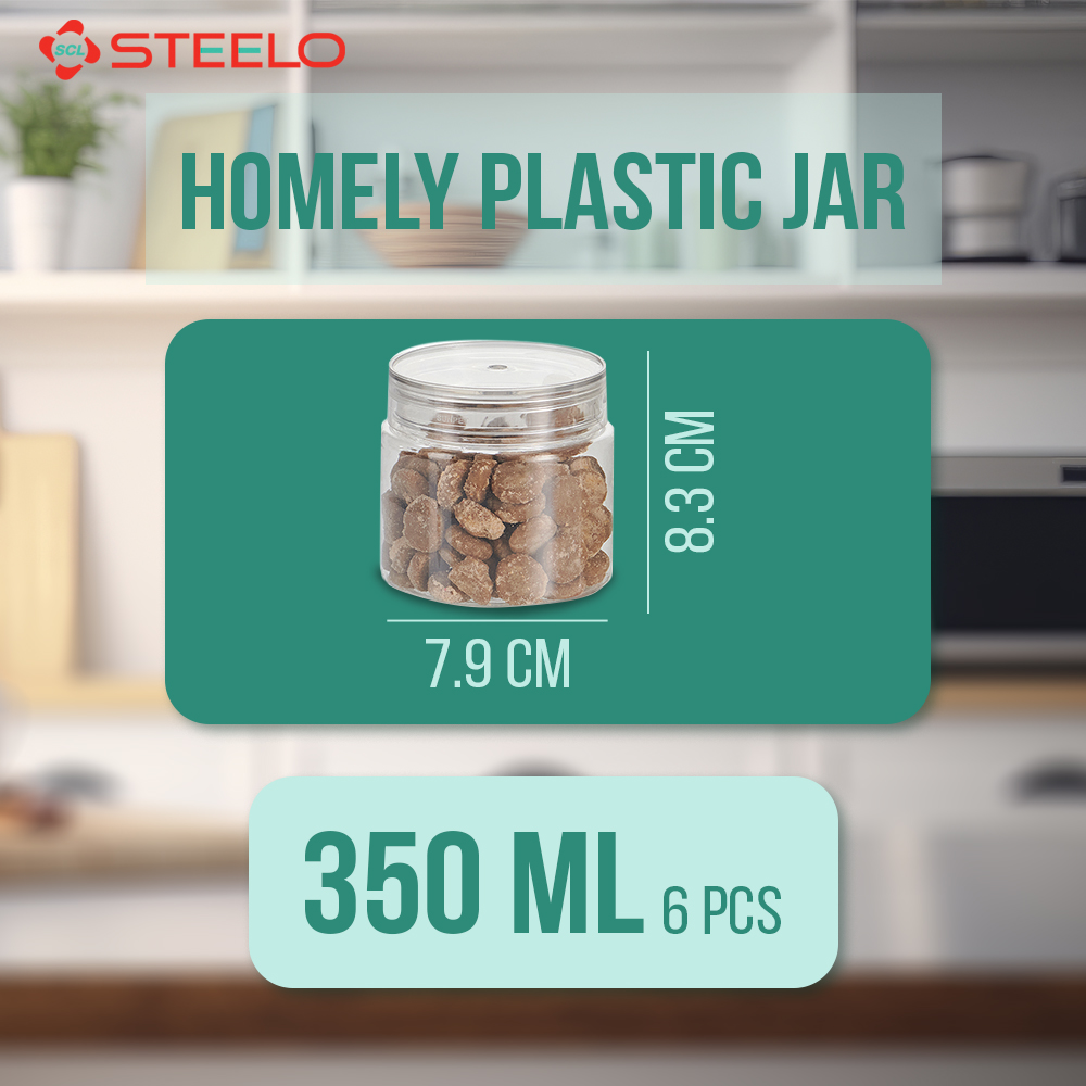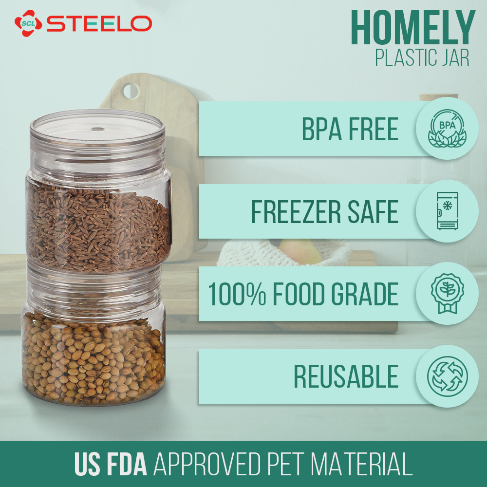 SCL Steelo Homely Jars are designed to bring both functionality and elegance to your kitchen storage. Made from premium quality, BPA-free PET plastic, these jars are lightweight, durable, and 100% food-safe, ensuring that your snacks, spices, pulses, and dry fruits stay fresh for longer. The crystal-clear body allows easy visibility of contents, while the wide-mouth design makes filling and cleaning effortless. With their sleek and modern look, these jars not only help in keeping your kitchen well-organized but also add a touch of style to your shelves or countertops. Perfect for everyday use, Steelo Homely Jars are the ideal choice for smart, hygienic, and clutter-free storage.