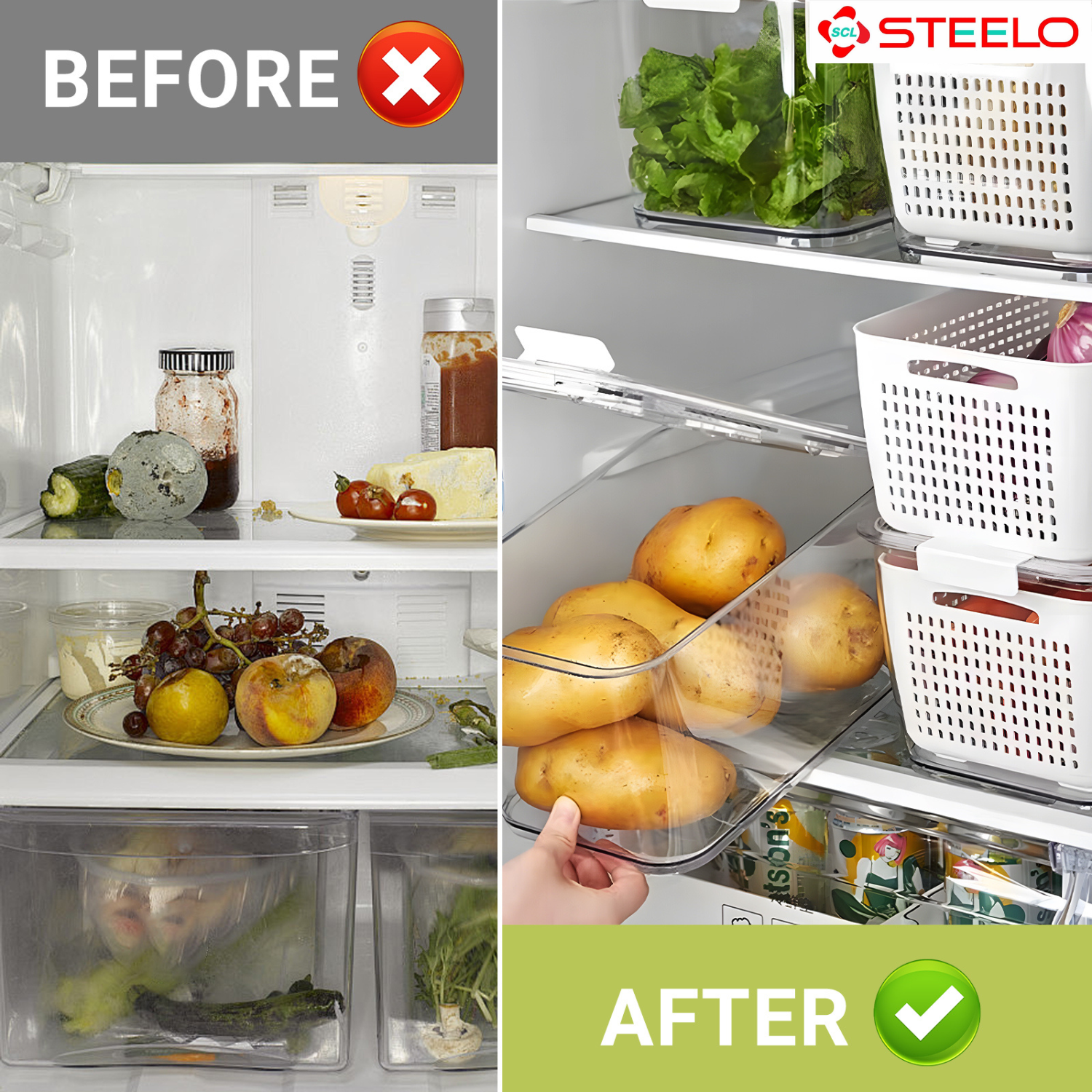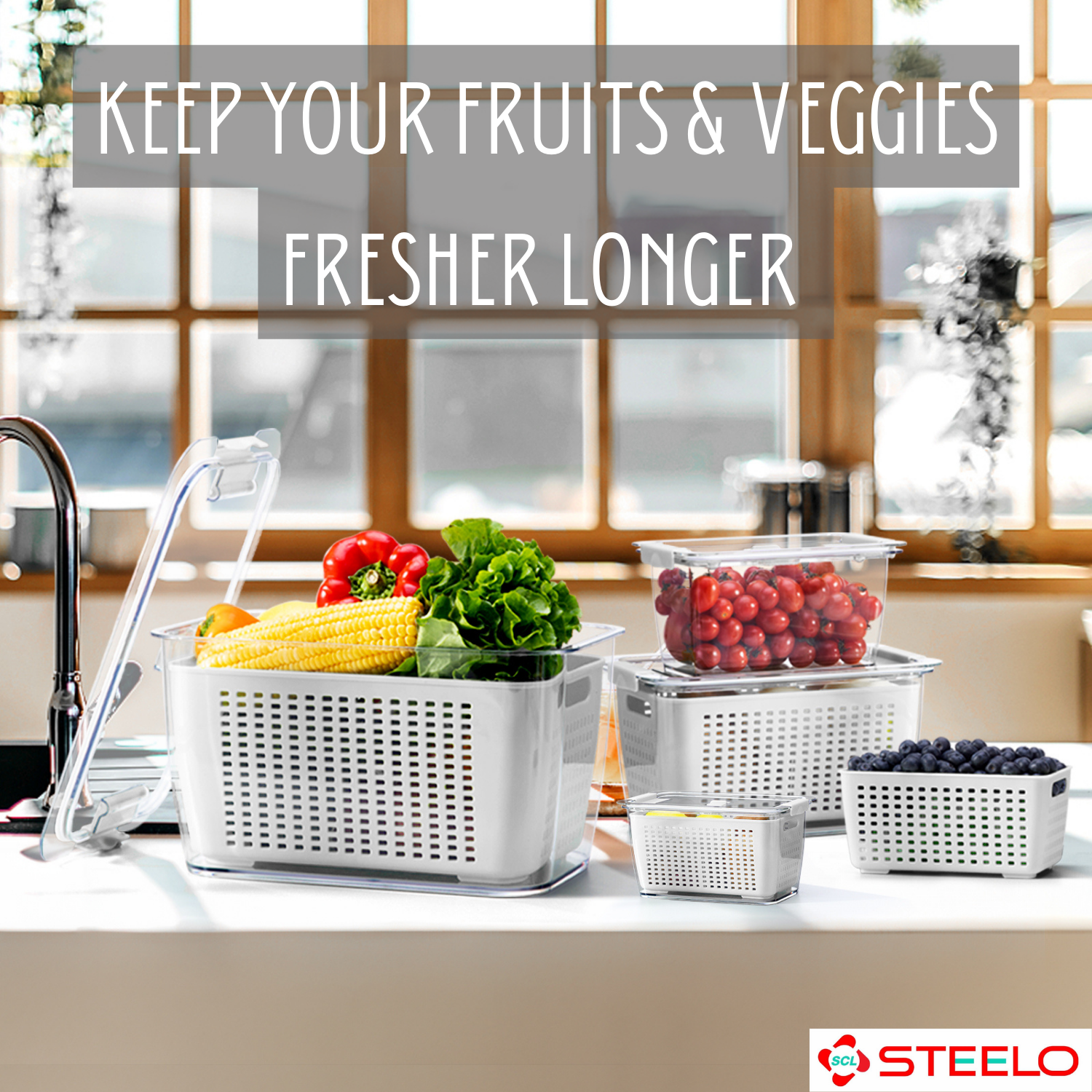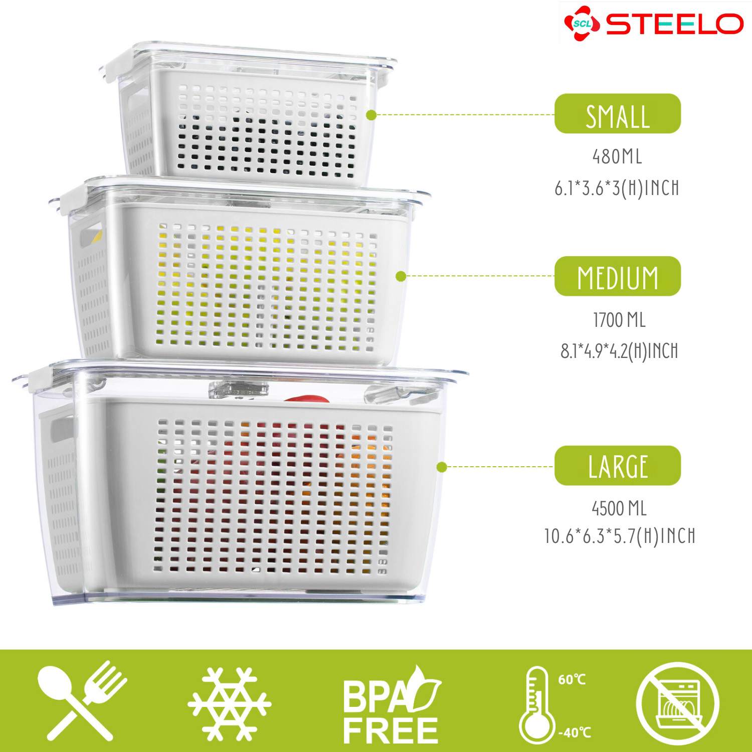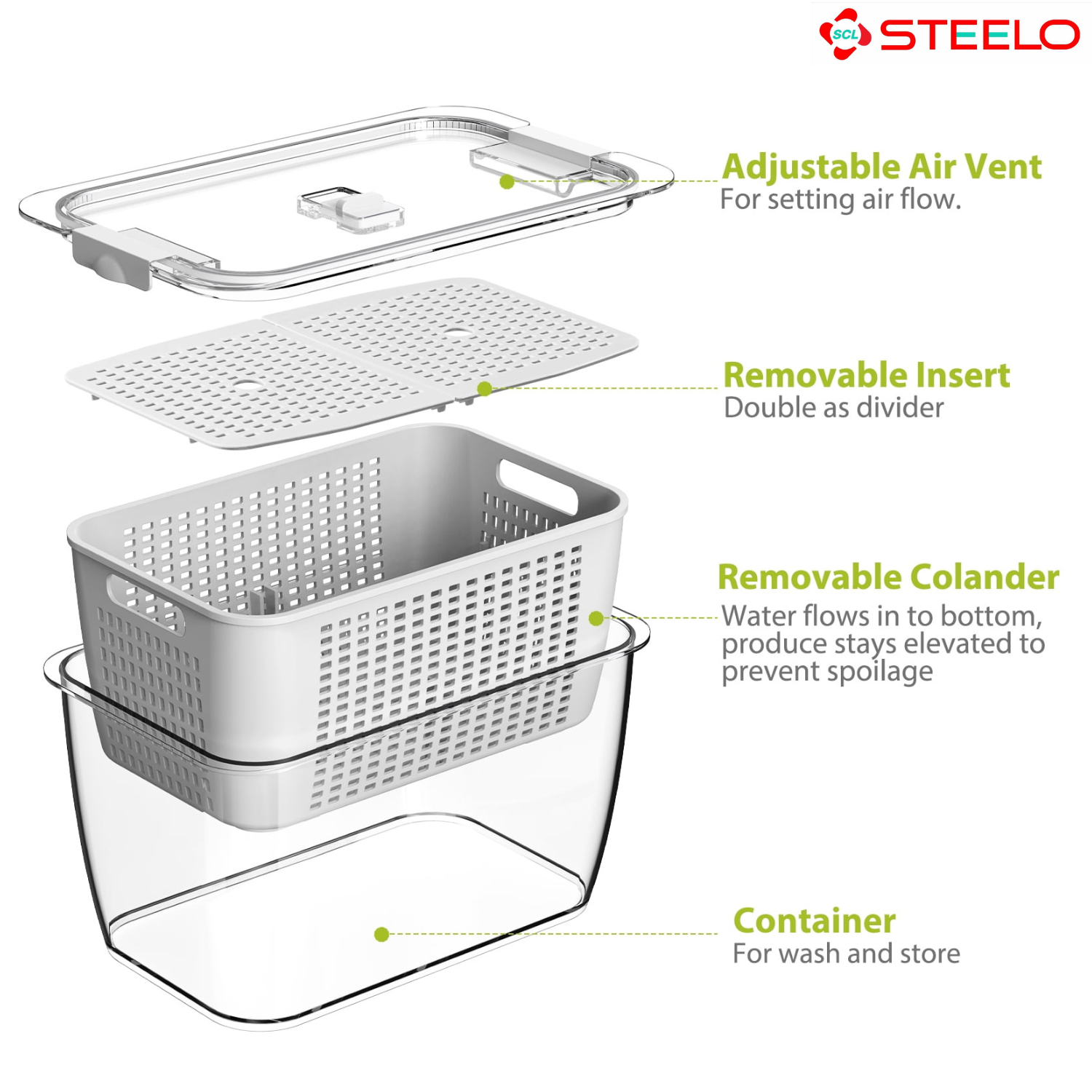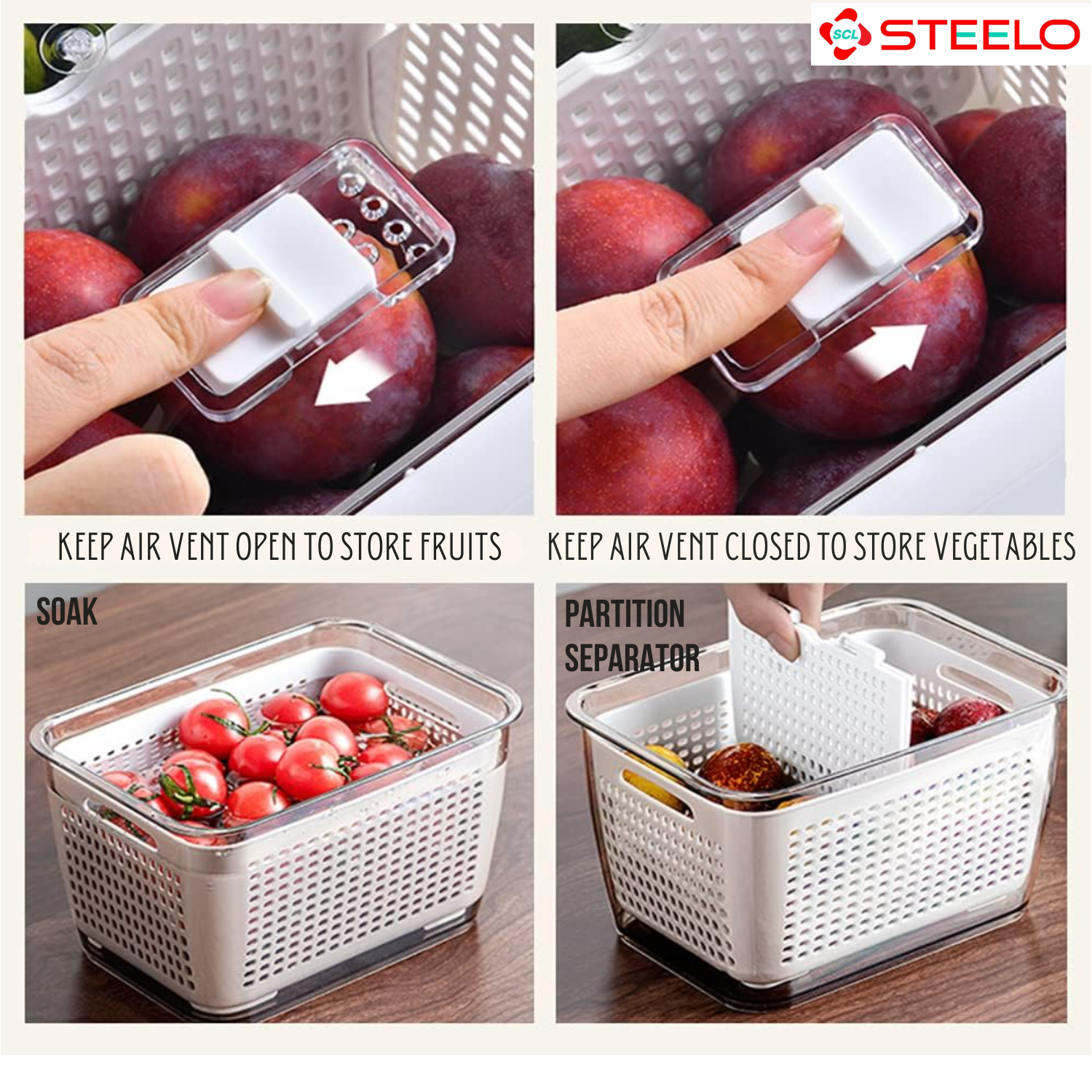 Detachable Inner Strainer Basket: Includes a removable strainer that promotes air circulation to keep fruits and vegetables fresh.