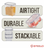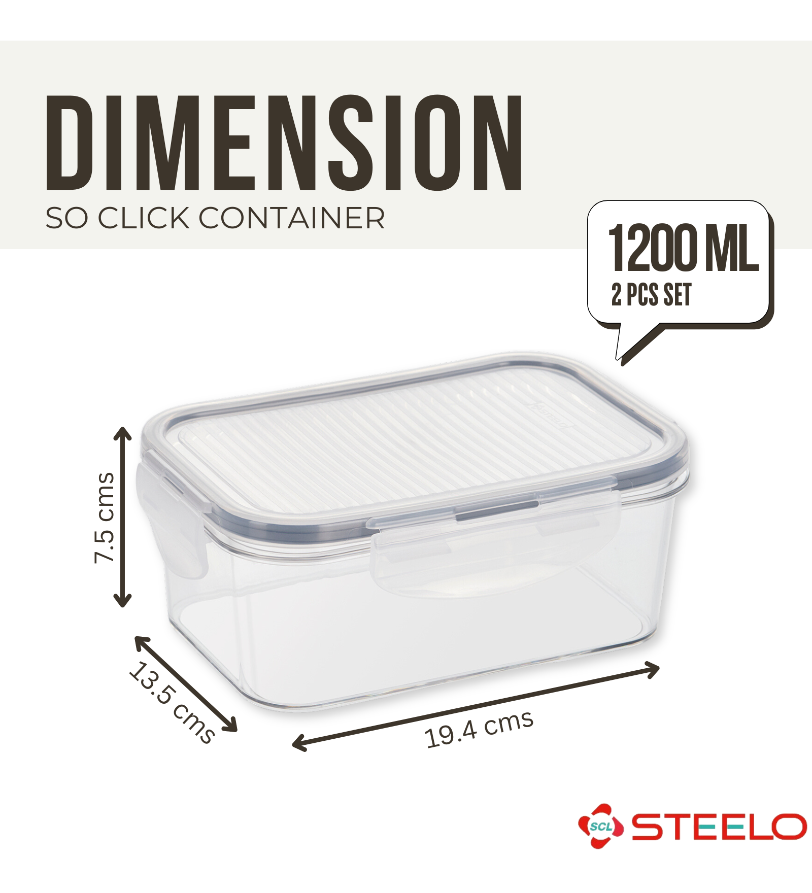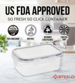 | SCL Steelo SoFresh SoClick Containers are designed to make food storage effortless, fresh, and stylish. Made from premium BPA-free, food-grade plastic, these containers are durable, lightweight, and safe for everyday use. Their standout feature is the smart SoClick locking mechanism, which provides a secure airtight seal with a simple click, ensuring your food stays fresh, crisp, and free from moisture. The clear body allows easy identification of contents, while the wide-mouth design makes filling, pouring, and cleaning hassle-free. Perfect for organizing pulses, cereals, snacks, dry fruits, or spices, SoFresh SoClick Containers not only keep your kitchen neatly arranged but also add a touch of modern functionality to your storage solutions. |