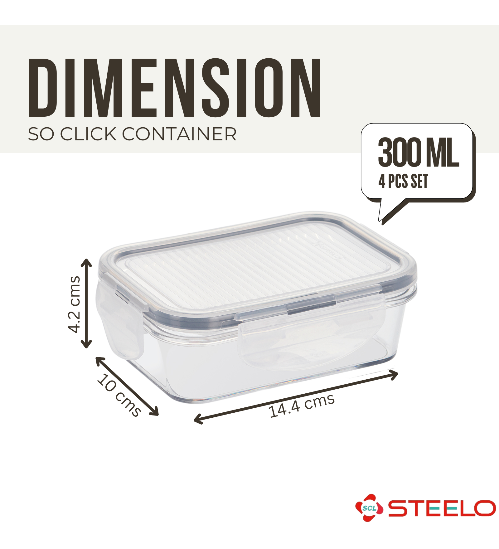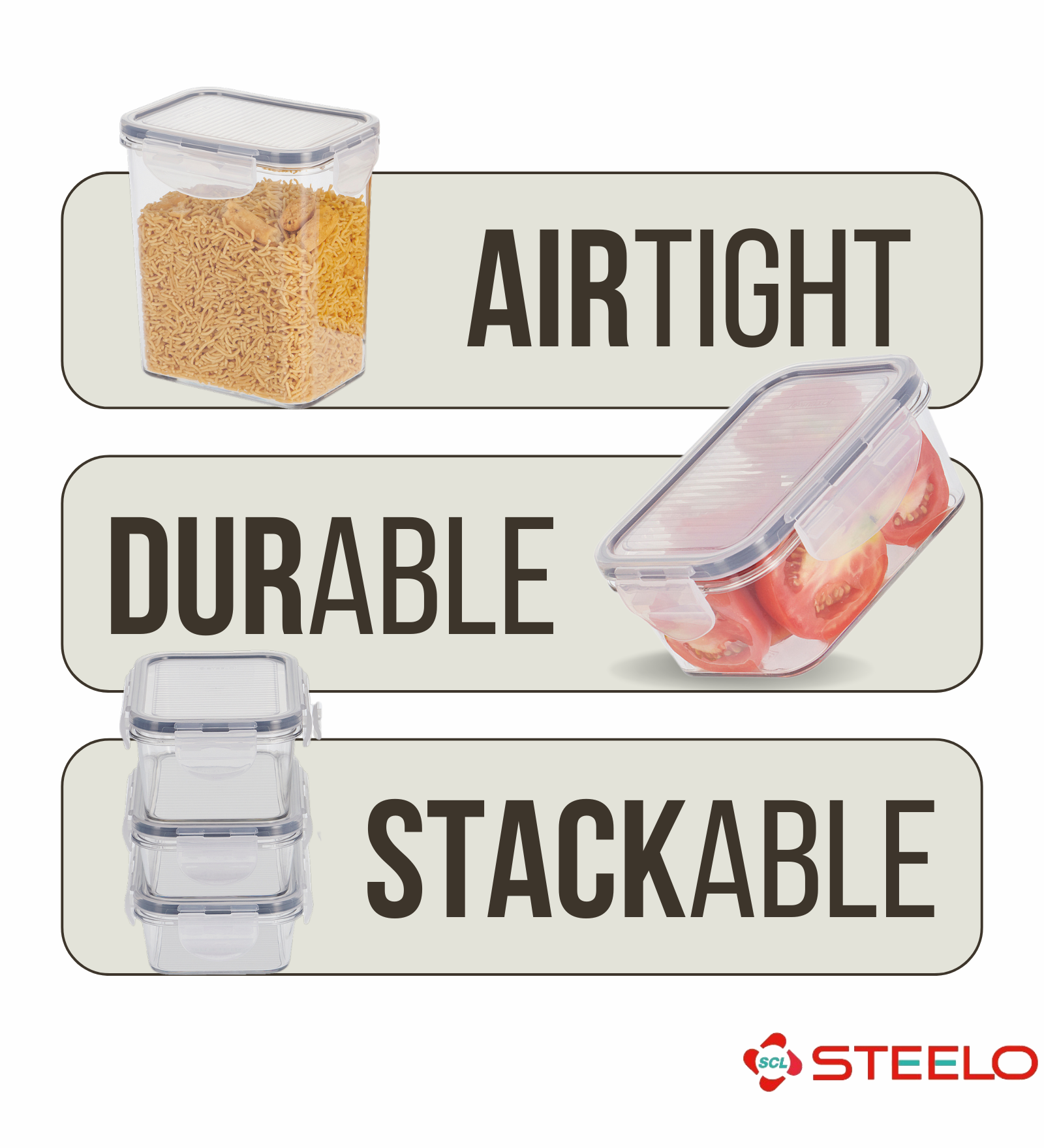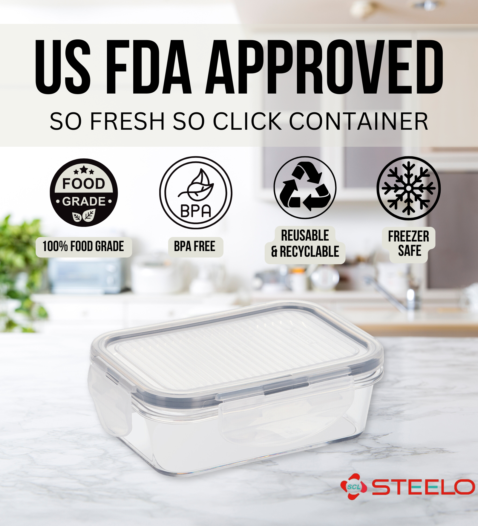 | SCL Steelo SoFresh SoClick Containers are designed to make food storage effortless, fresh, and stylish. Made from premium BPA-free, food-grade plastic, these containers are durable, lightweight, and safe for everyday use. Their standout feature is the smart SoClick locking mechanism, which provides a secure airtight seal with a simple click, ensuring your food stays fresh, crisp, and free from moisture. The clear body allows easy identification of contents, while the wide-mouth design makes filling, pouring, and cleaning hassle-free. Perfect for organizing pulses, cereals, snacks, dry fruits, or spices, SoFresh SoClick Containers not only keep your kitchen neatly arranged but also add a touch of modern functionality to your storage solutions. |