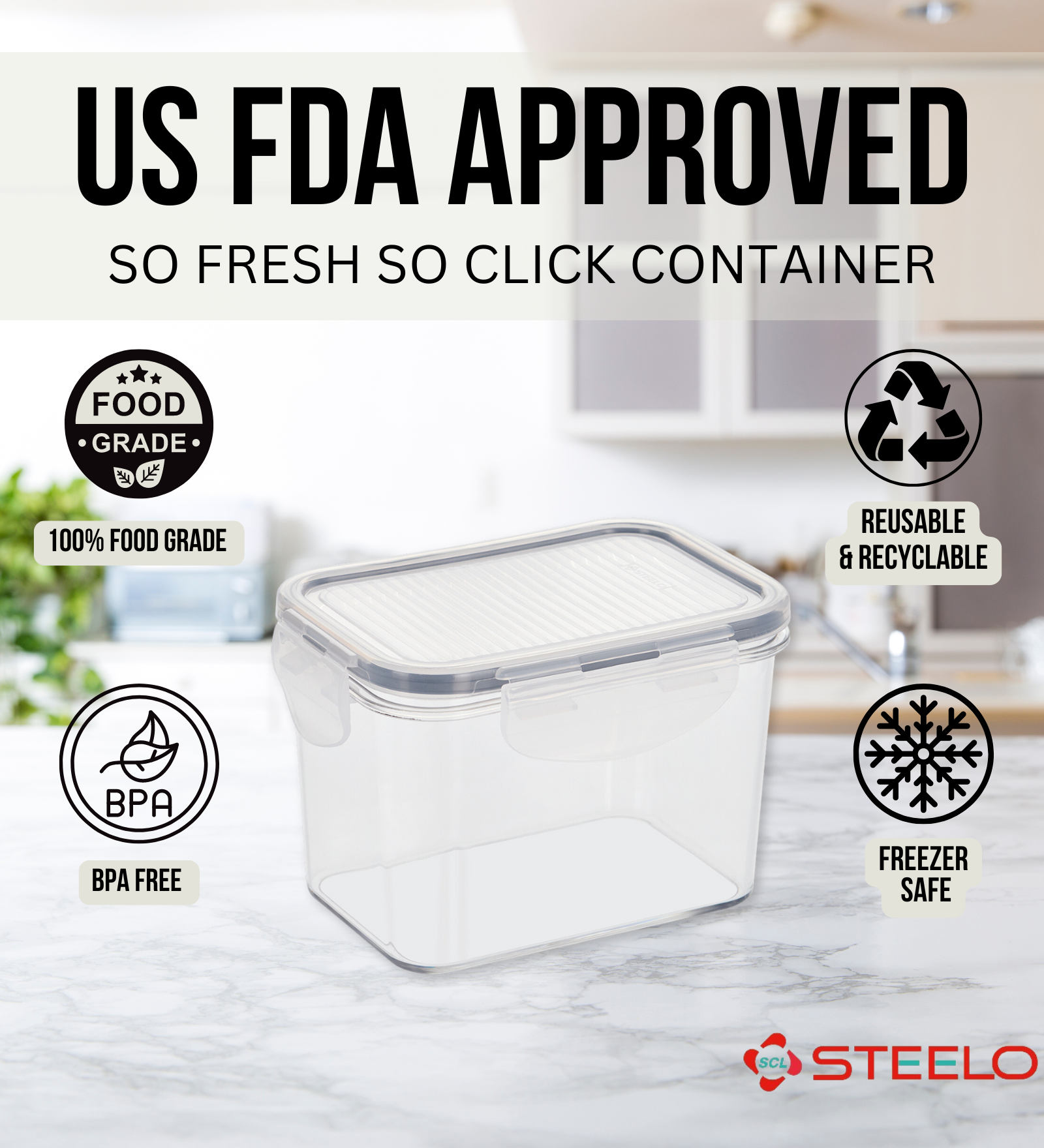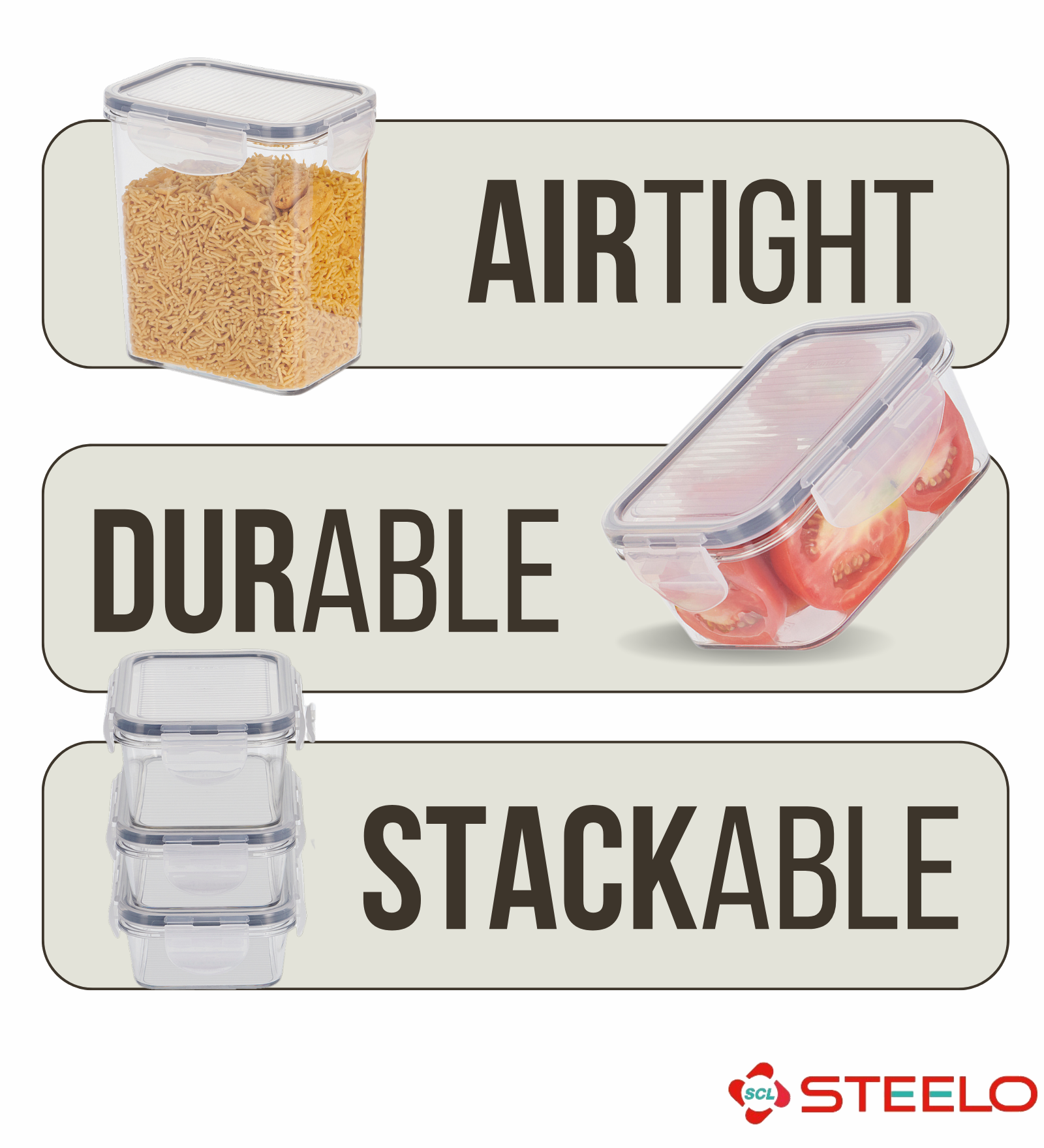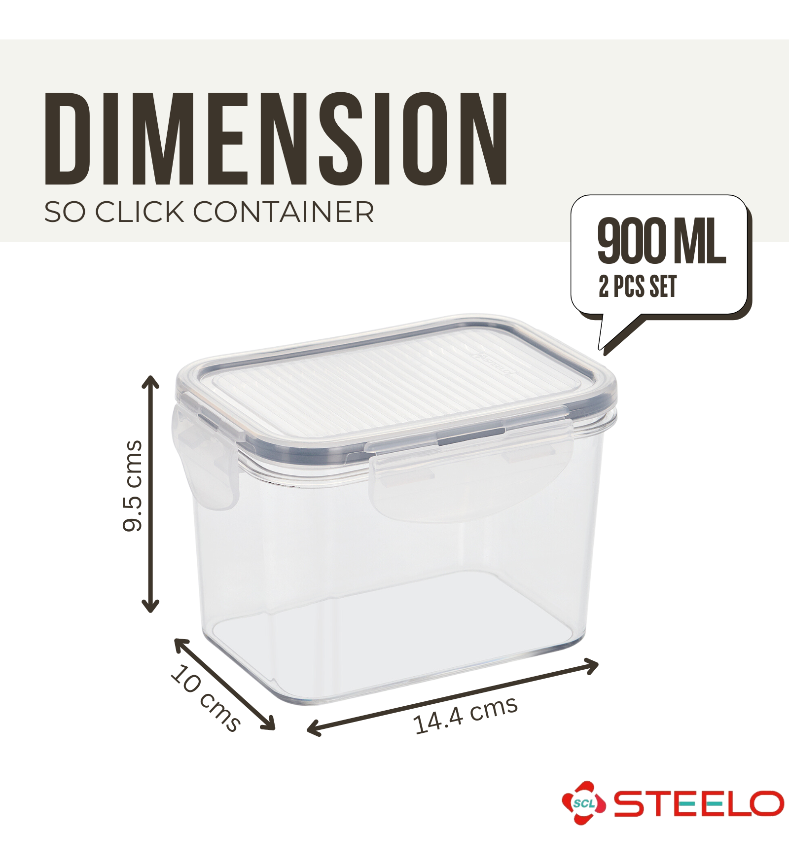 | SCL Steelo SoFresh SoClick Containers are designed to make food storage effortless, fresh, and stylish. Made from premium BPA-free, food-grade plastic, these containers are durable, lightweight, and safe for everyday use. Their standout feature is the smart SoClick locking mechanism, which provides a secure airtight seal with a simple click, ensuring your food stays fresh, crisp, and free from moisture. The clear body allows easy identification of contents, while the wide-mouth design makes filling, pouring, and cleaning hassle-free. Perfect for organizing pulses, cereals, snacks, dry fruits, or spices, SoFresh SoClick Containers not only keep your kitchen neatly arranged but also add a touch of modern functionality to your storage solutions. |