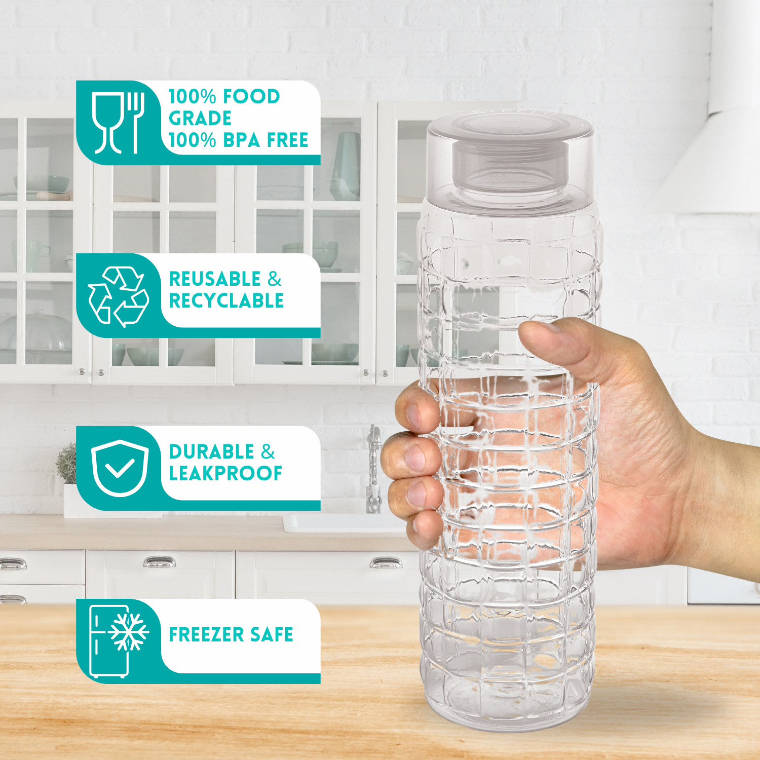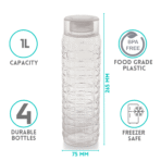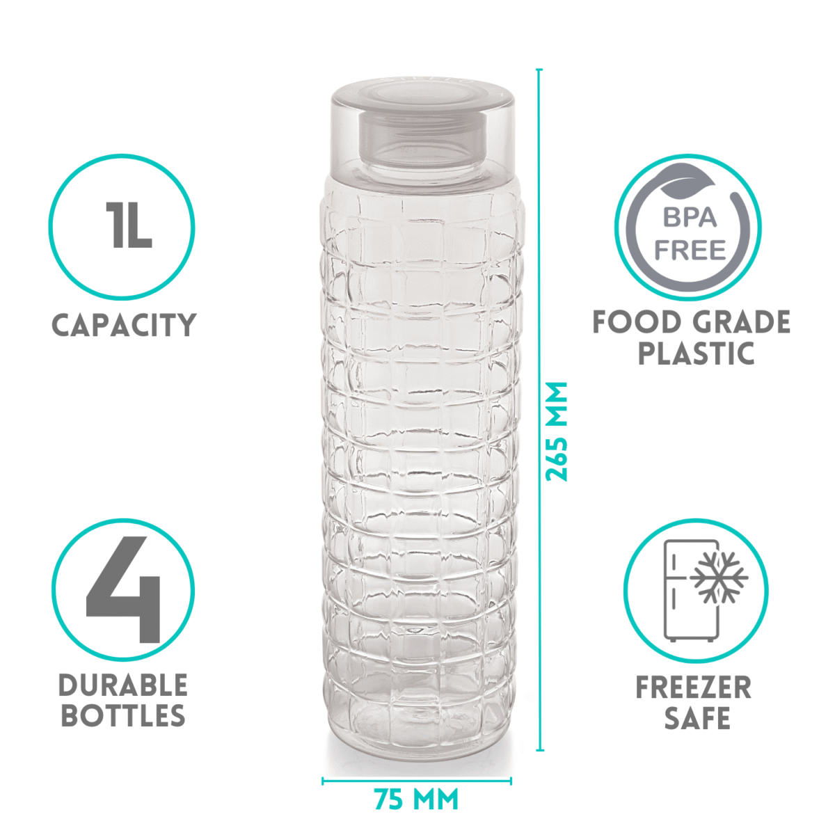 SCL Steelo Water Bottles are designed to keep you hydrated in style, whether at home, office, gym, or travel. This 4-piece set of 1000 ml bottles is made from premium BPA-free, food-grade PET plastic, ensuring safe, durable, and lightweight use. Each bottle features a leak-proof cap and ergonomic design for easy handling and comfortable drinking. The crystal-clear body allows you to monitor water levels at a glance, while the sleek, modern finish makes these bottles both practical and visually appealing. Perfect for everyday hydration, these Steelo Water Bottles combine convenience, safety, and style in one complete set.