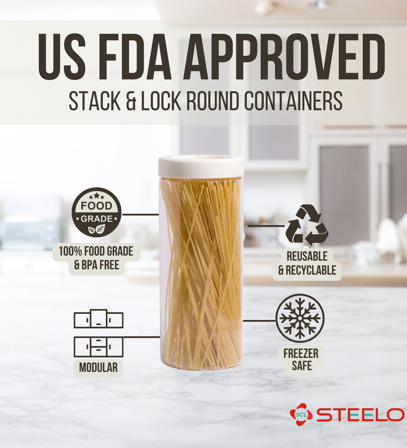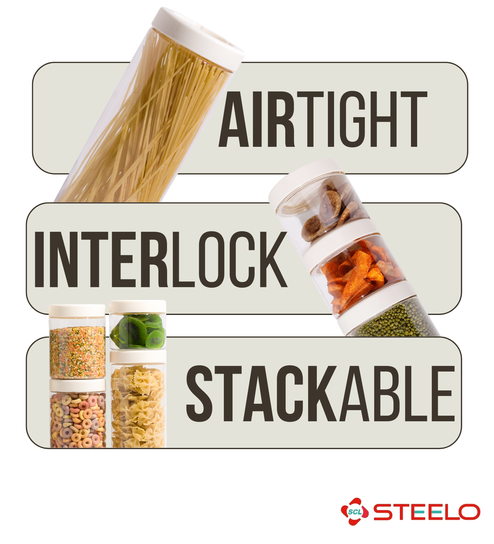 | SCL Steelo Stack & Lock Round Containers are designed to maximize storage efficiency while keeping your kitchen neat and stylish. Made from premium BPA-free, food-grade plastic, these containers are lightweight, durable, and completely safe for everyday use. Their unique interlocking mechanism allows you to stack containers securely on top of one another, saving valuable shelf and counter space while preventing slips or tumbles. Available in four convenient sizes, these round containers come with airtight lids that lock in freshness and protect food items from moisture. The crystal-clear body provides quick visibility of contents, and the wide-mouth opening makes filling, pouring, and cleaning simple. Perfect for storing pulses, cereals, snacks, dry fruits, and spices, the Stack & Lock Round Containers bring smart functionality and modern elegance to your kitchen storage. |