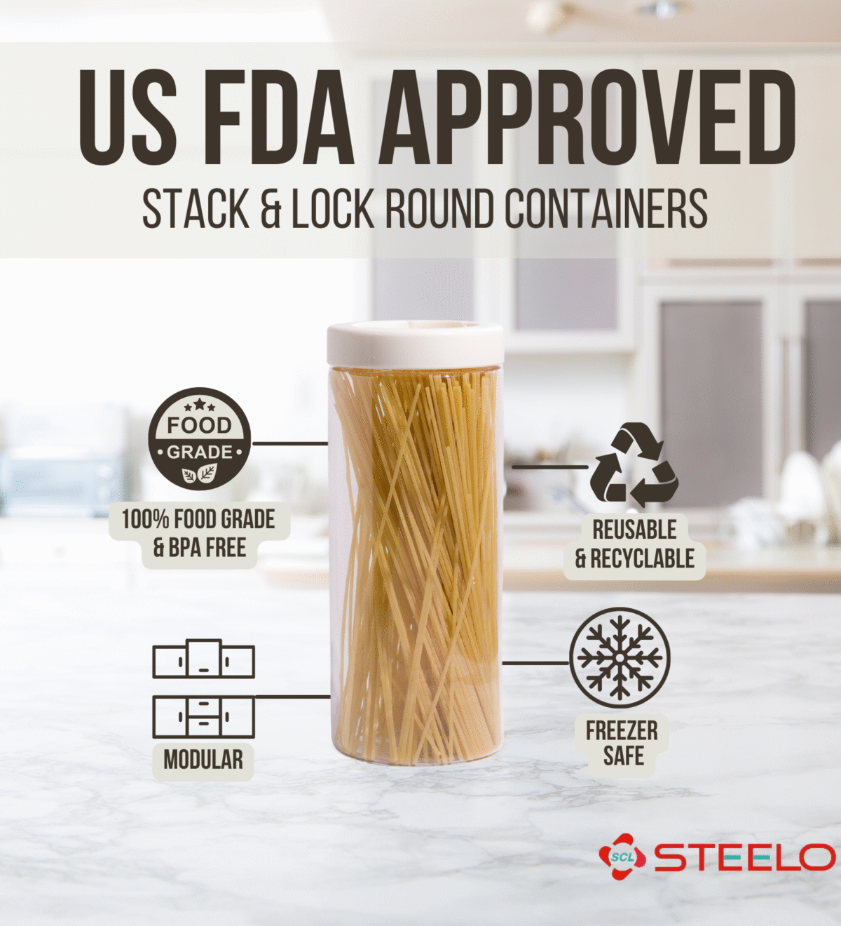 SCL Steelo Stack & Lock Round Containers are designed to maximize storage efficiency while keeping your kitchen neat and stylish. Made from premium BPA-free, food-grade plastic, these containers are lightweight, durable, and completely safe for everyday use. Their unique interlocking mechanism allows you to stack containers securely on top of one another, saving valuable shelf and counter space while preventing slips or tumbles. Available in four convenient sizes, these round containers come with airtight lids that lock in freshness and protect food items from moisture. The crystal-clear body provides quick visibility of contents, and the wide-mouth opening makes filling, pouring, and cleaning simple. Perfect for storing pulses, cereals, snacks, dry fruits, and spices, the Stack & Lock Round Containers bring smart functionality and modern elegance to your kitchen storage. |