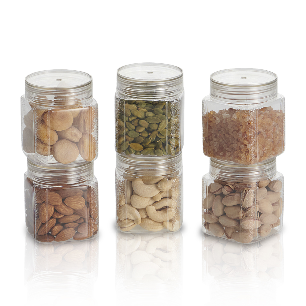 – the perfect blend of clarity, strength, and sophistication. Each container is made from crystal-clear BPA-free plastic and topped with a sleek stainless steel lid for an airtight seal. Whether you’re storing grains, dals, spices, or dry snacks, these jars keep your food fresh and visible at all times. Designed to be stackable, space-saving, and modern, these jars bring effortless elegance to your kitchen shelves and drawers. Their square shape ensures maximum utilization of storage space, and their clear body makes it easy to monitor stock levels. Durable, hygienic, and beautifully designed, the Varg Stainless Jar Set is your go-to solution for a clean and efficient kitche |